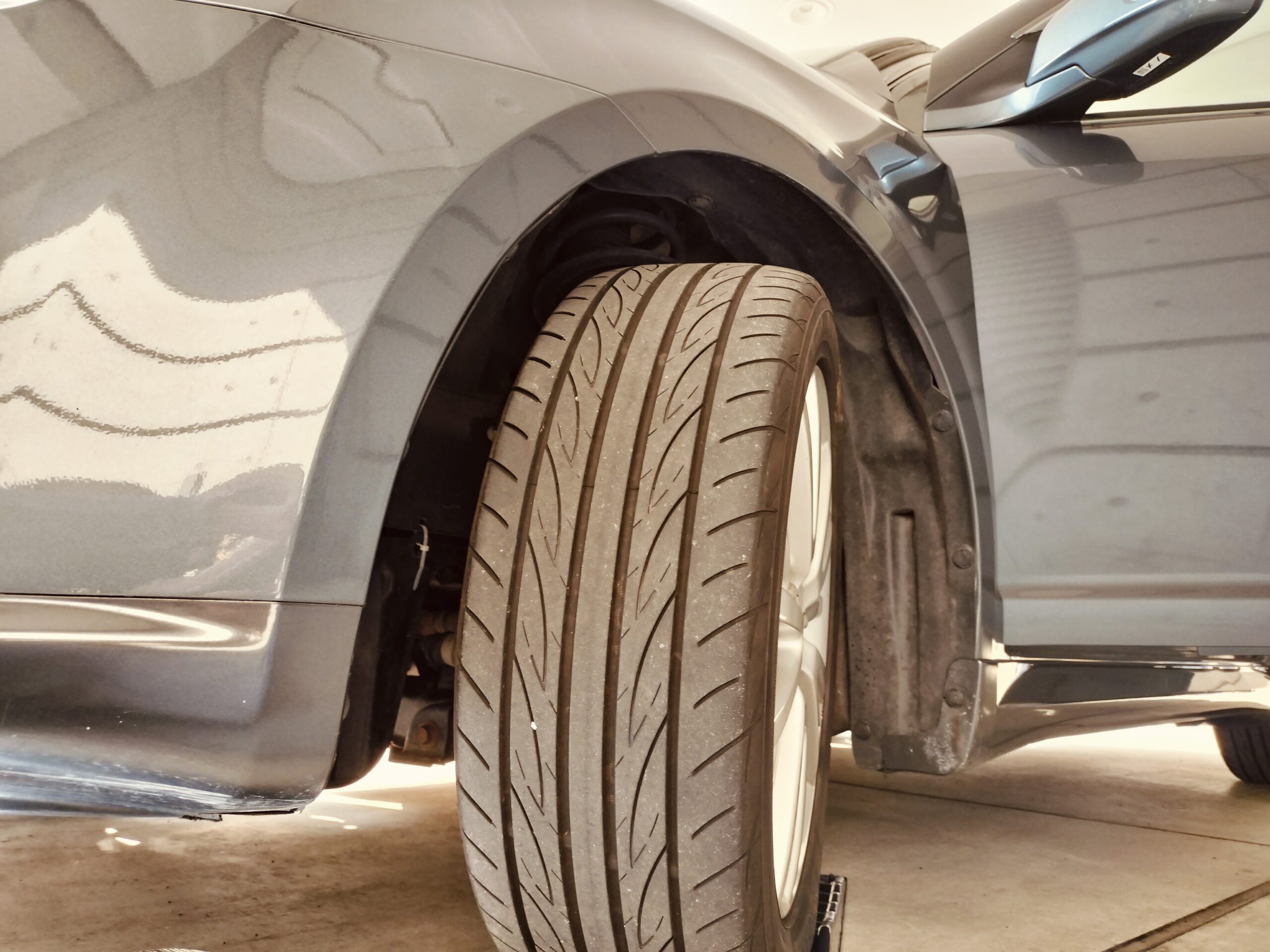 またタイヤを外すのは面倒なのでハンドルを目一杯左に切り、スロープで車高を稼ぎます。